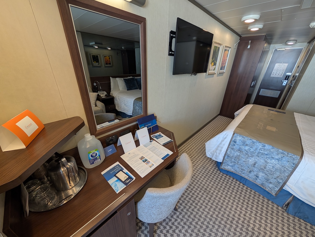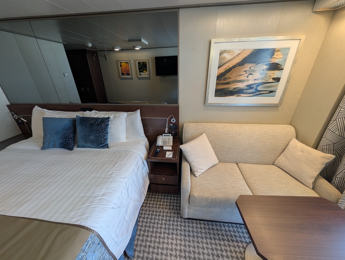 The small couch and a table are next to the bed. Unlike other staterooms I’ve been in, there is no storage above the couch which make the room feel more open.