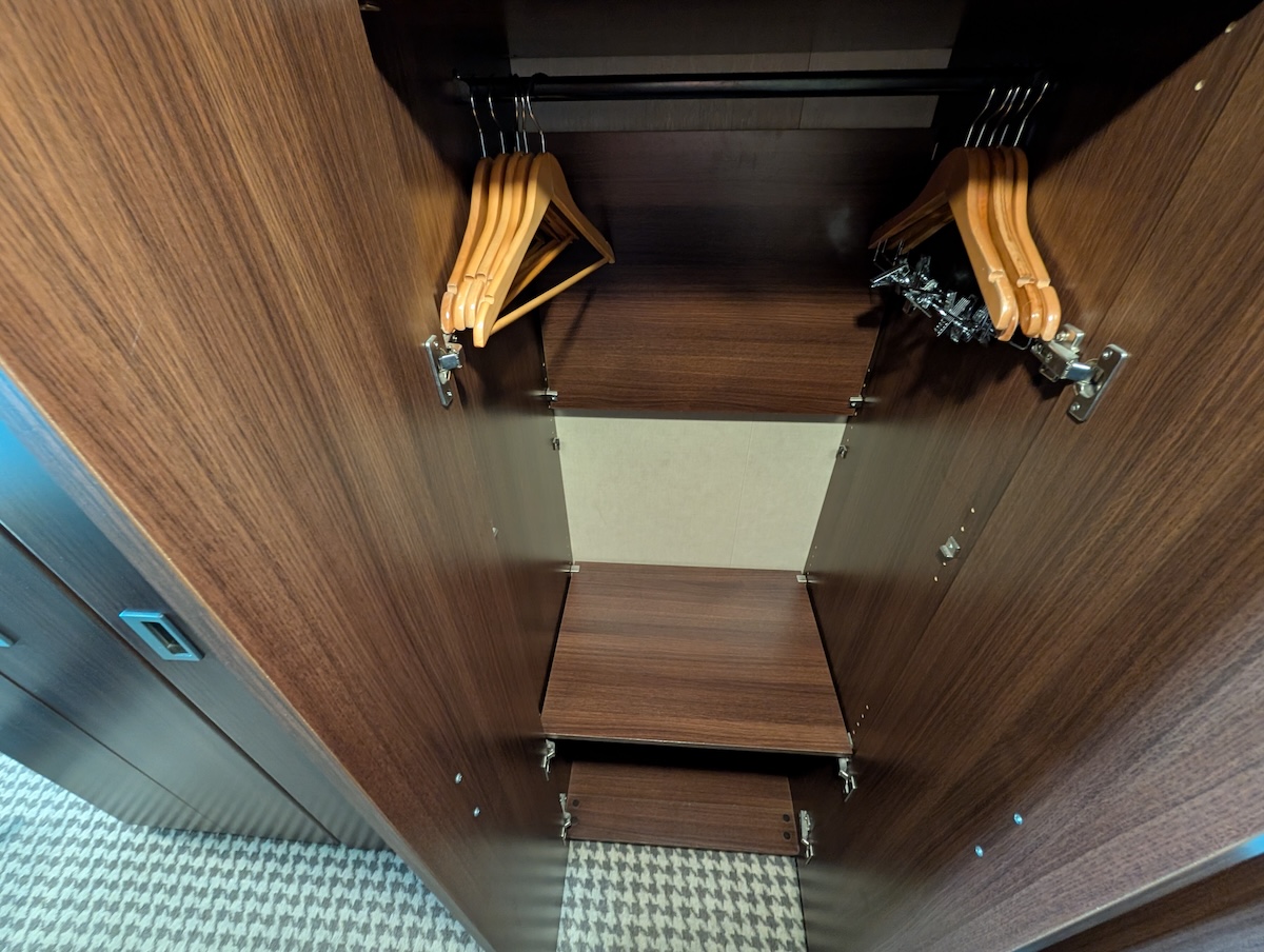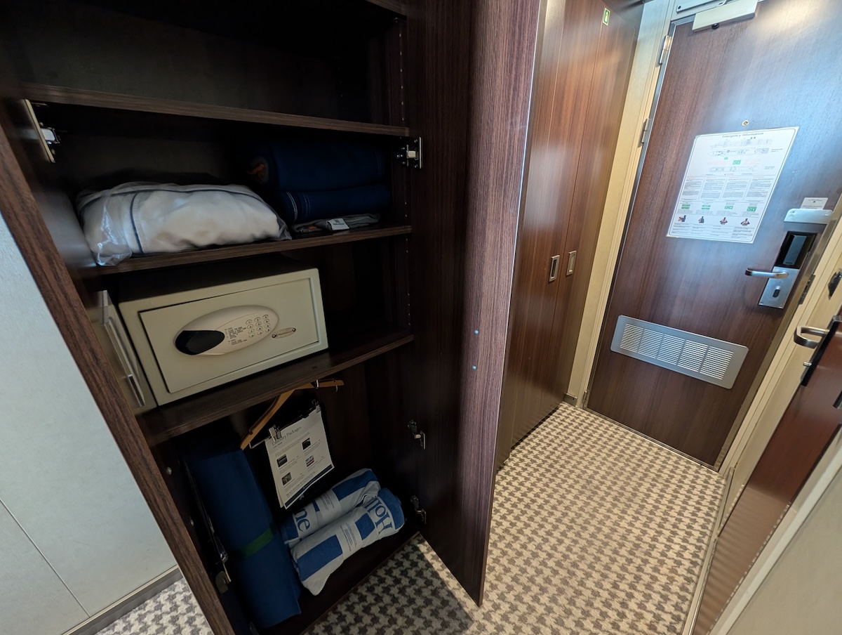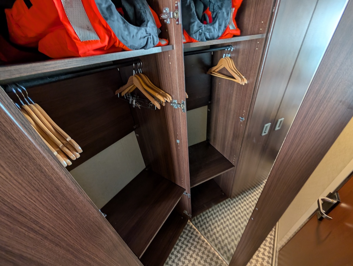 The closets offer plenty of storage. The closet closest to the bed has the safe, robe, beach towels and a yoga mat (one of the benefits of the Spa class room).