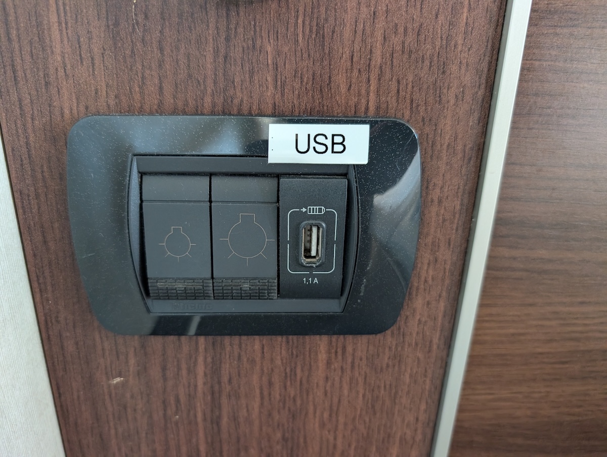 On either side of the bed is a small table along with light controls and a USB-A power outlet. There are no standard power outlets but there are a couple at the desk.