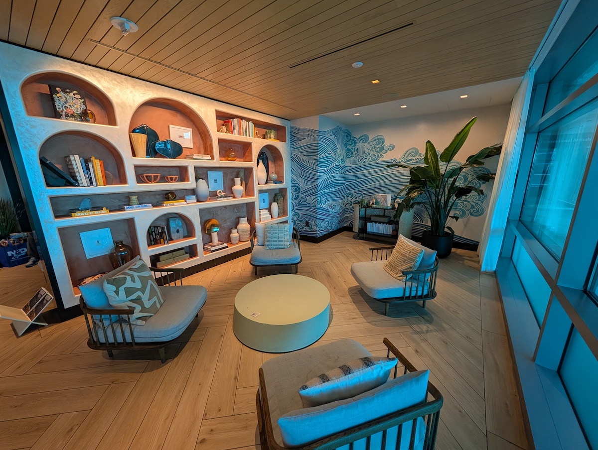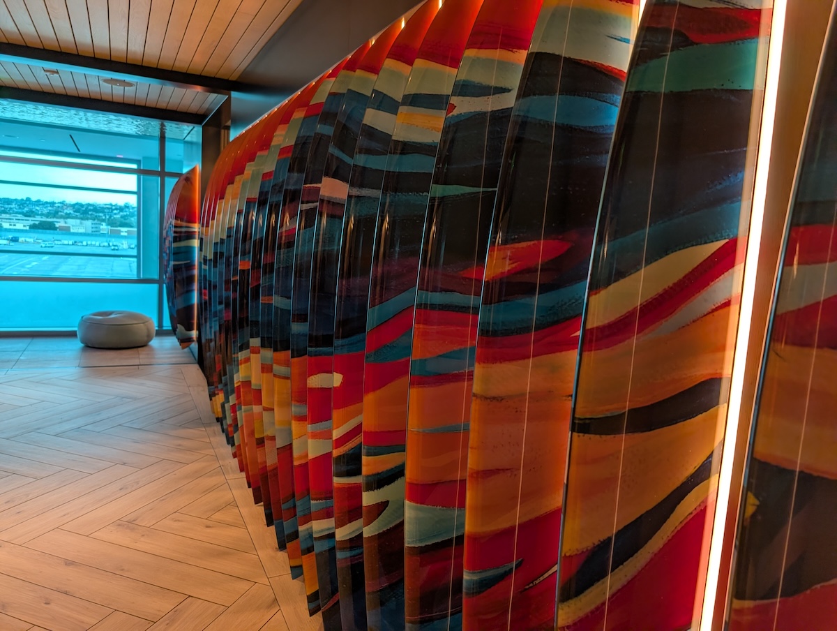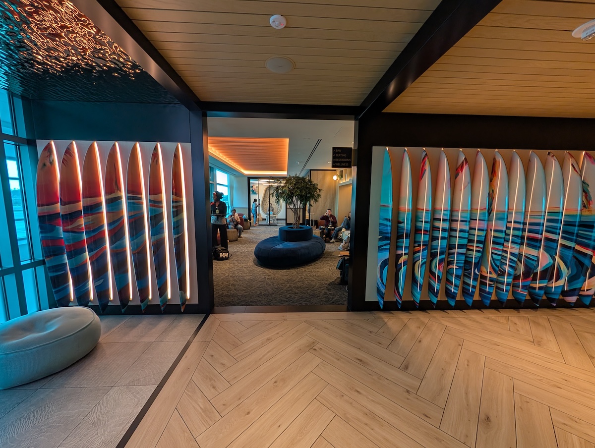 Opposite the beverage station is a feature wall with surfboards. The decor throughout the lounge is going for southern California aesthetic with light wood and bright touches.