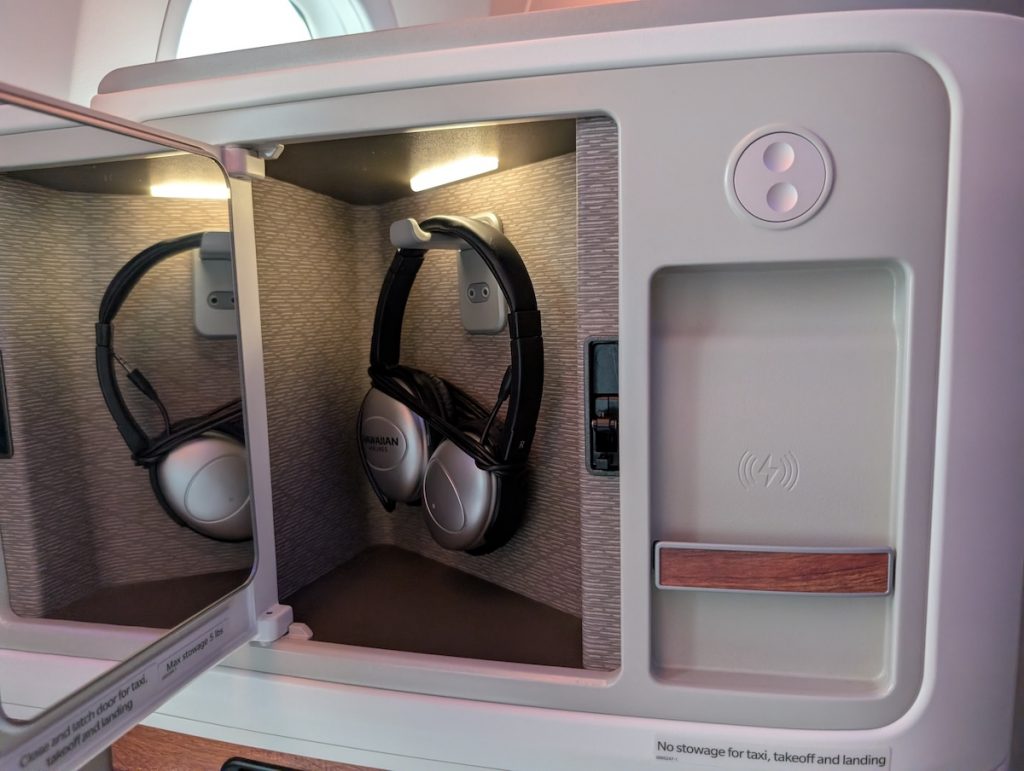 Next to the seat is a small locker for headphones with a built in mirror. Next to the locker is a light sconce that has three different brightness settings.