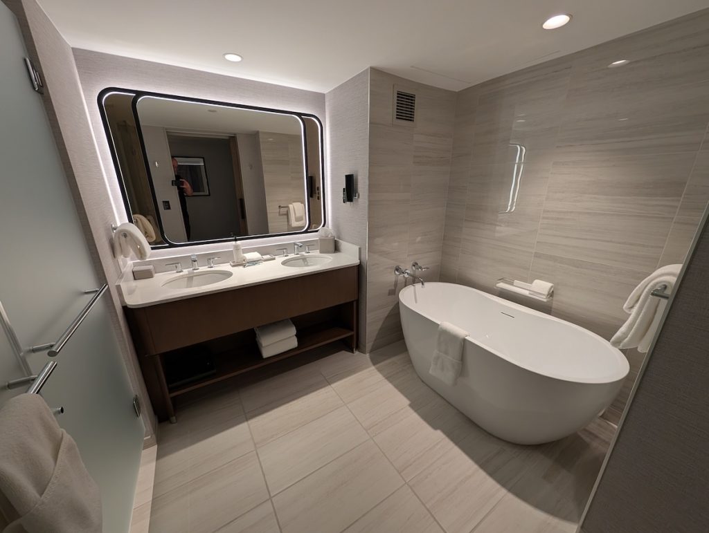 The one bathroom in the suite is located back by the door (which is not super convenient if you need to get up in the night). It has also bee completely remodeled as the old bathrooms were dark with black tile and glass. Now the bathroom has a separate soaking tub, large shower, dual vanity and toilet cubicle.