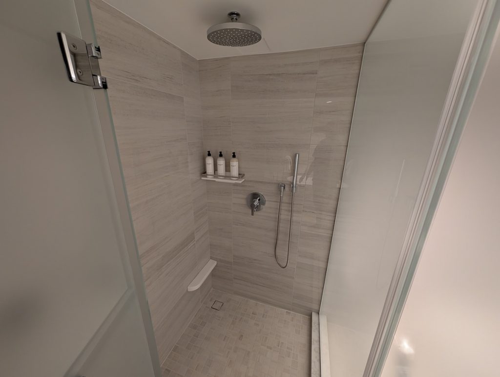 The shower has both a rain shower and handheld wand. The bath products are all Ballmain.