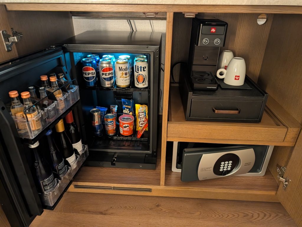 To the right of the TV is the mini bar space, coffee set up, and safe.