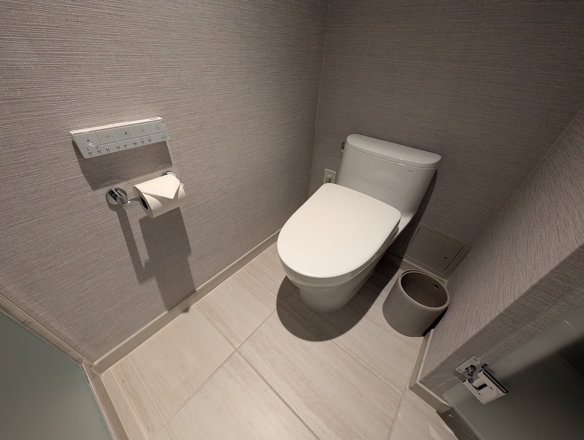 The toilet has a built in Japanese-style bidet; though the remote wasn’t working. The toilet still lit up, was heated, opened the lid automatically and for some reason sprayed a mist.