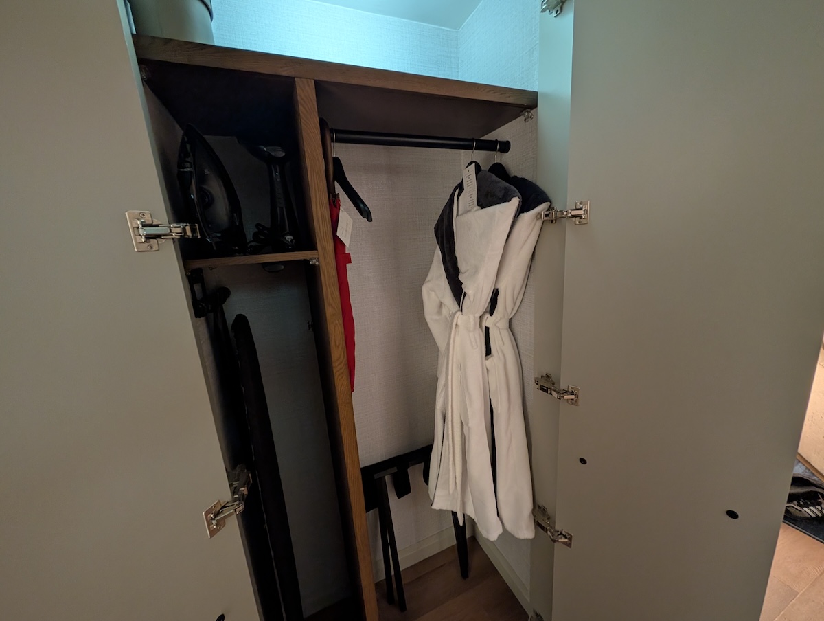 Inside the hall closet are robes, an umbrella, iron, clothes steamer and extra toilet paper.