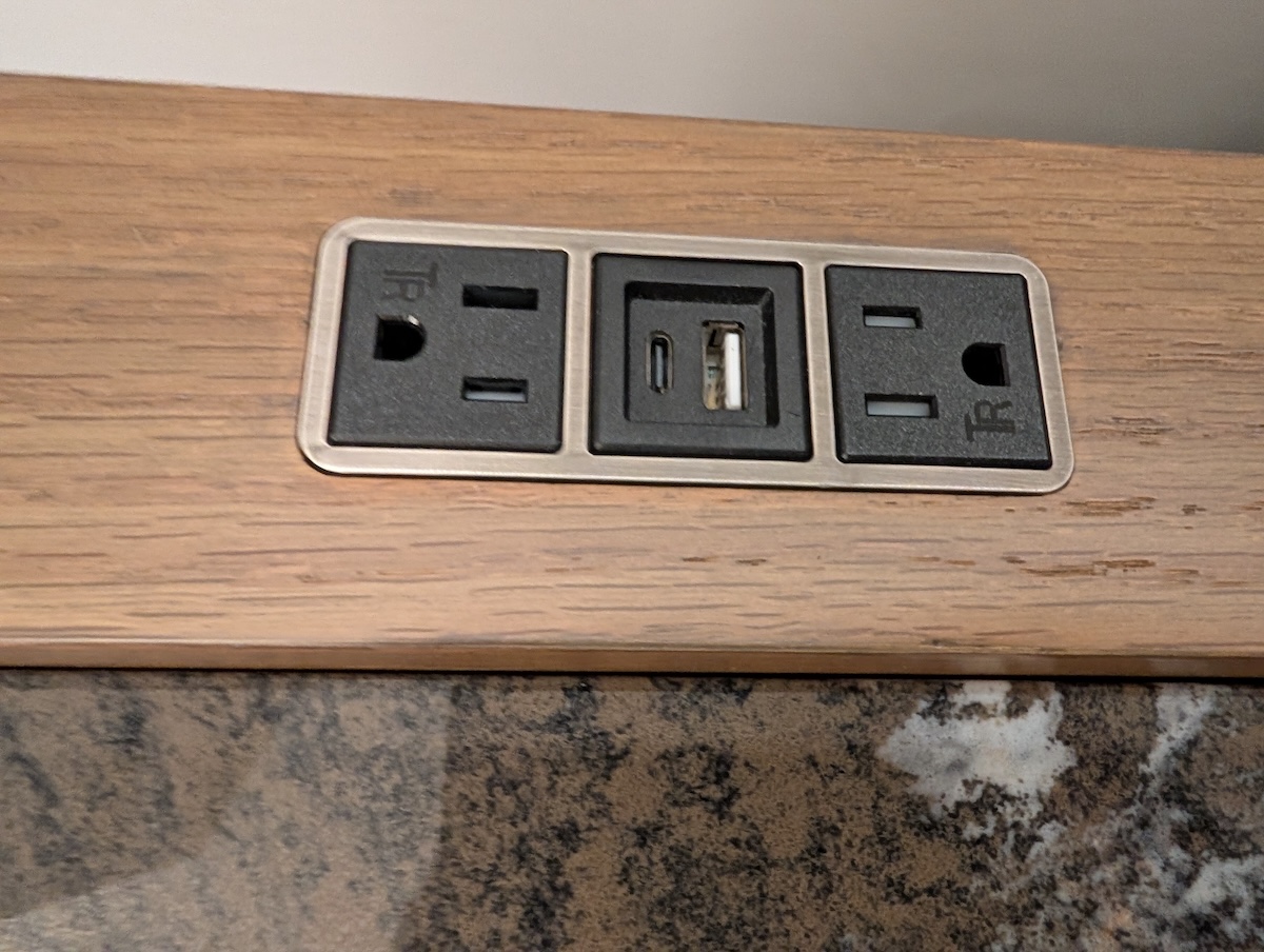 There are a ton of outlets throughout the room; including regular US power outlets, USB-A and USB-C. There is a wireless phone charger on the alarm clock next to the bed.