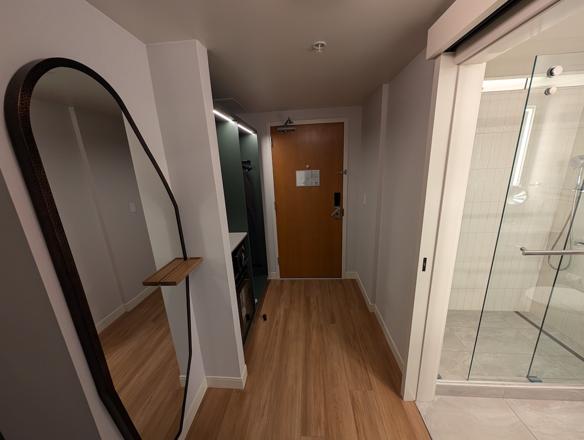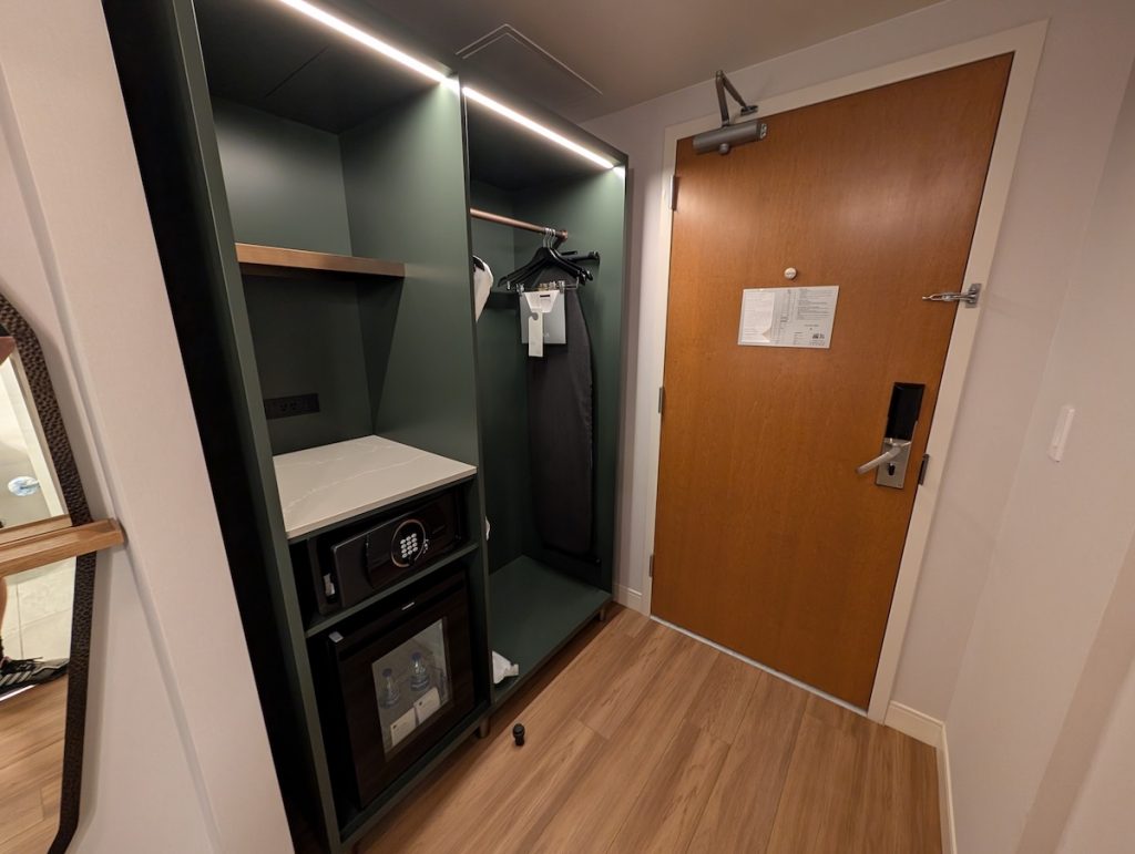 Back towards the bathroom (and a second door out to the hallway and elevators) is another fridge, safe and open closet space. Robes and slippers are provided.