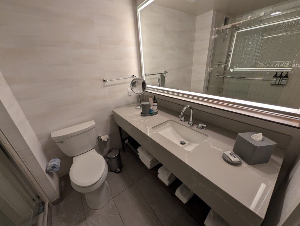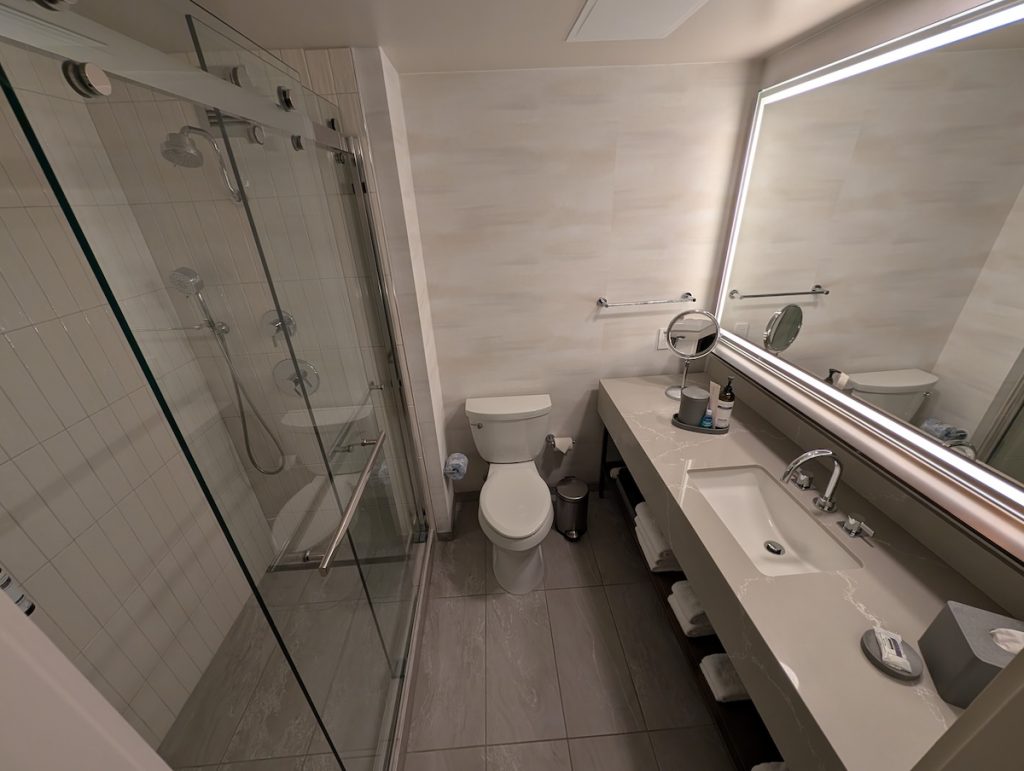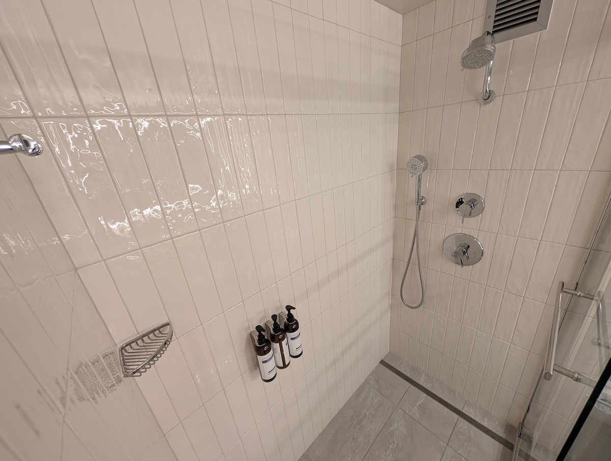 The bathroom has a single vanity and a large shower (I’m guessing it was formerly a tub). The shower has a wall mounted shower head in addition to a handheld shower. I found the water pressure to be low; my guess is that the showers are low flow.