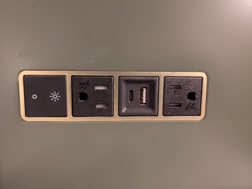 The bedroom and living room each have their own thermostat. There are also a large number of outlets (standard power, USB-A and USB-C throughout the room.