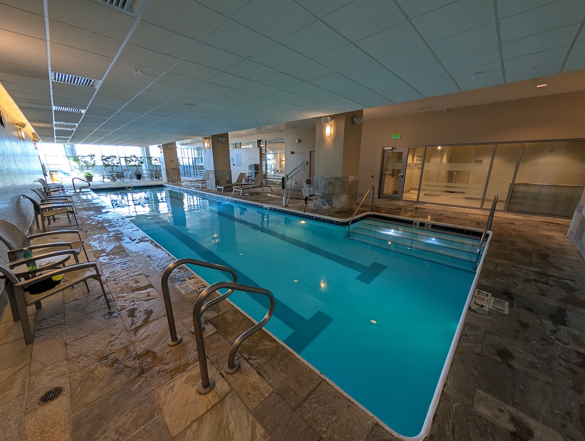 The indoor pool is accessed through locker rooms and the hot tub is just past the pool on an outside patio.